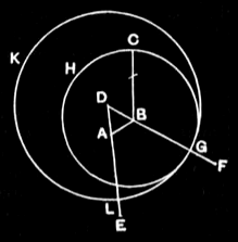 Let the straight lines AE, BF be produced in a straight line with DA, DB; [I.post.2] with centre B and distance BC let the circle CGH be described; [I.post.3] and again, with centre D and distance DG let the circle GKL be described. [I.post.3]