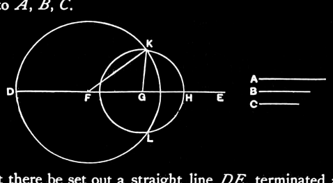 Let there be set out a straight line DE, terminated at D but of infinite length in the direction of E, and let DF be made equal to A, FG equal to B, and GH equal to C. [I.3]