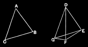 Then, since AB is equal to DE, and AC to DG, the two sides BA, AC are equal to the two sides ED, DG, respectively; and the angle BAC is equal to the angle EDG; therefore the base BC is equal to the base EG. [I.4]