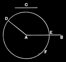 At the point A let AD be placed equal to the straight line C; [I.2] and with centre A and distance AD let the circle DEF be described. [I.post.3] Now, since the point A is the centre of the circle DEF, AE is equal to AD. [I.def.15] But C is also equal to AD. Therefore each of the straight lines AE, C is equal to AD; so that AE is also equal to C. [I.cn.1]
