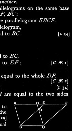 For the same reason also EF is equal to BC, so that AD is also equal to EF; [I.cn.1] and DE is common; therefore the whole AE is equal to the whole DF. [I.cn.2]
