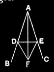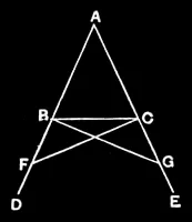 In isosceles triangles the angles at the base are equal to one another, and, if the equal straight lines be produced further, the angles under the base will be equal to one another.