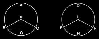 the radii are also equal; therefore the two sides BK, KC are equal to the two sides EL, LF; and they contain equal angles; therefore the base BC is equal to the base EF. [I.4]