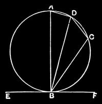 For let a straight line EF touch the circle ABCD at the point B, and from the point B let there be drawn across, in the circle ABCD, a straight line BD cutting it; I say that the angles which BD makes with the tangent EF will be equal to the angles in the alternate segments of the circle, that is, that the angle FBD is equal to the angle constructed in the segment BAD, and the angle EBD is equal to the angle constructed in the segment DCB.