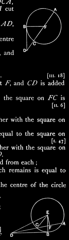 If a point be taken outside a circle and from it there fall on the circle two straight lines, and if one of them cut the circle and the other touch it, the rectangle contained by the whole of the straight line which cuts the circle and the straight line intercepted on it outside between the point and the convex circumference will be equal to the square on the tangent.