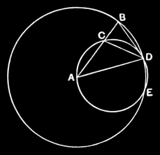 Let any straight line AB be set out, and let it be cut at the point C so that the rectangle contained by AB, BC is equal to the square on CA; [II.11] with centre A and distance AB let the circle BDE be described, and let there be fitted in the circle BDE the straight line BD equal to the straight line AC which is not greater than the diameter of the circle BDE. [IV.1]