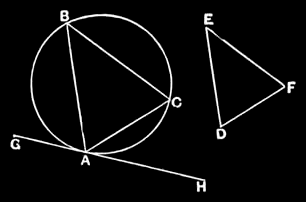Let GH be drawn touching the circle ABC at A [III.16.p.1]; on the straight line AH, and at the point A on it, let the angle HAC be constructed equal to the angle DEF, and on the straight line AG, and at the point A on it, let the angle GAB be constructed equal to the angle DFE; [I.23] let BC be joined.