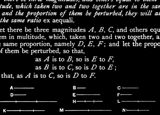 Since, then, there are three magnitudes G, H, L, and others equal to them in multitude K, M, N, which taken two and two together are in the same ratio, and the proportion of them is perturbed, therefore, ex aequali, if G is in excess of L, K is also in excess of N; if equal, equal; and if less, less. [V.21]