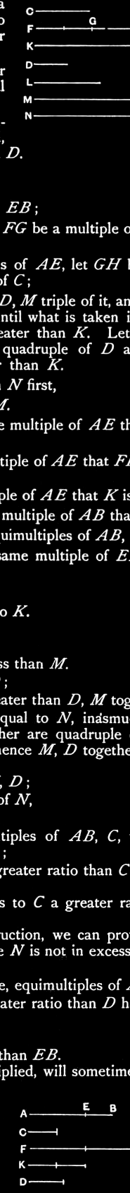 First, let AE be less than EB; let AE be multiplied, and let FG be a multiple of it which is greater than D; then, whatever multiple FG is of AE, let GH be made the same multiple of EB and K of C; and let L be taken double of D, M triple of it, and successive multiples increasing by one, until what is taken is a multiple of D and the first that is greater than K. Let it be taken, and let it be N which is quadruple of D and the first multiple of it that is greather than K.