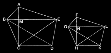 And since, as the triangle ABE is to the triangle FGL, so is EBC to LGH, and further ECD to LHK, therefore also, as one of the antecedents is to one of the consequents so are all the antecedents to all the consequents; [V.12 therefore, as the triangle ABE is to the triangle FGL, so is the polygon ABCDE to the polygon FGHKL.