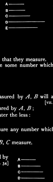 Since A, B measure D, and D measures E, therefore also A, B measure E.