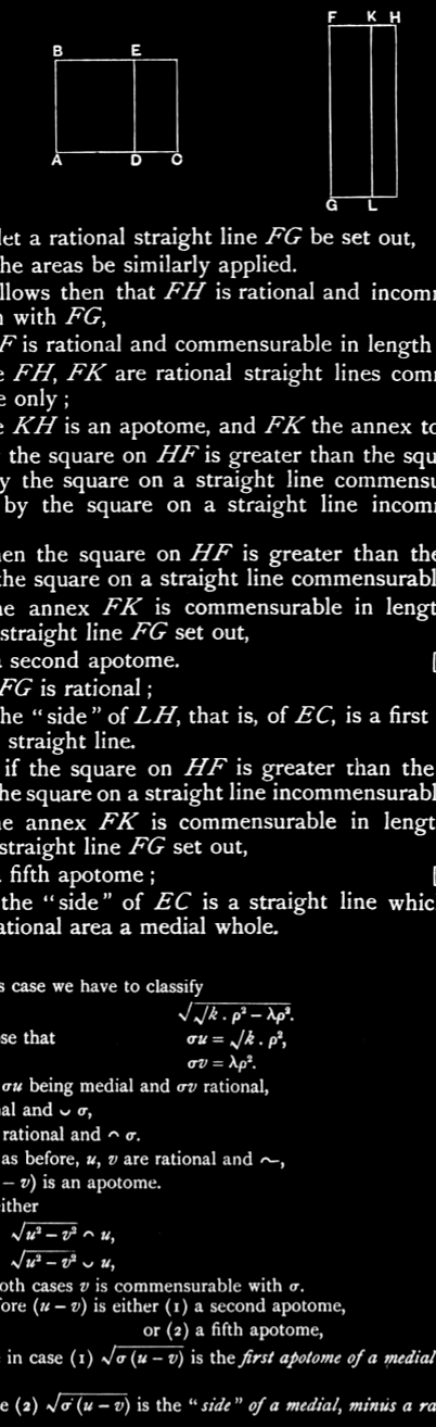 But, if the square on HF is greater than the square on FK by the square on a straight line incommensurable with HF, while the annex FK is commensurable in length with the rational straight line FG set out, KH is a fifth apotome; [X.def.3.5] so that the side of EC is a straight line which produces with a rational area a medial whole. [X.95]