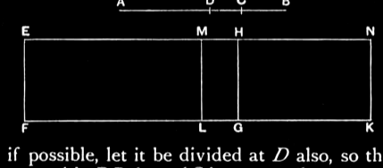 For, if possible, let it be divided at D also, so that AC is not the same with DB, but AC is supposed greater; it is then clear that the squares on AD, DB are also, as we proved above [Lemma], less than the squares on AC, CB; and suppose that AD, DB are medial straight lines commensurable in square only and containing a medial rectangle.