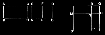 Let GH, EK, FL be drawn from G, E, F parallel to either of the straight lines AB, CD; let the square SN be constructed equal to the parallelogram AH, and the square NQ equal to GK, [II.14] and let them be placed so that MN is in a straight line with NO; therefore RN is also in a straight line with NP.