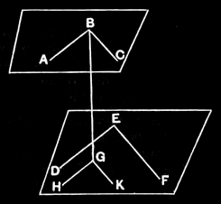 For let BG be drawn from the point B perpendicular to the plane through DE, EF [XI.11], and let it meet the plane at the point G; through G let GH be drawn parallel to ED, and GK parallel to EF. [I.31]