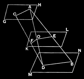For the same reason, since the two parallel planes GH, KL are cut by the plane AOFC, their common sections AC, OF are parallel. [id.]