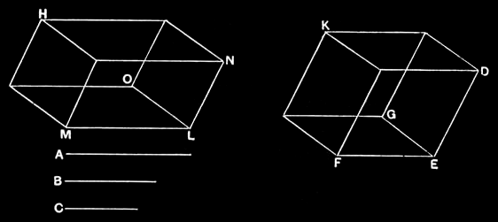 And LH is the solid formed out of A, B, C, and EK the solid on B; therefore the parallelepipedal solid formed out of A, B, C is equal to the solid on B which is equilateral, but equiangular with the aforesaid solid. Q. E. D.