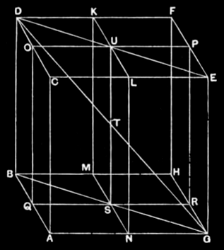 For let the sides of the opposite planes CF, AH of the cube AF be bisected at the points K, L, M, N, O, Q, P, R, and through the points of section let the planes KN, OR be carried; let US be the common section of the planes, and DG the diameter of the cube AF.