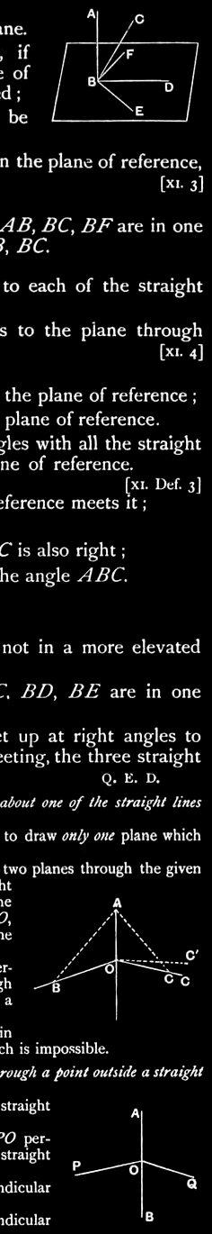 Therefore, if a straight line be set up at right angles to three straight lines, at their point of meeting, the three straight lines are in one plane. Q. E. D.