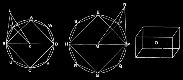 But, by hypothesis, the cone of which the circle ABCD is the base and the point L the vertex has also to the solid O the ratio triplicate of that which BD has to FH; therefore, as the cone of which the circle ABCD is the base and the point L the vertex is to the solid O, so is the pyramid of which the polygon ATBUCVDW is the base and L the vertex to the pyramid of which the polygon EPFQGRHS is the base and the point N the vertex; therefore, alternately, as the cone of which the circle ABCD is the base and L the vertex is to the pyramid contained in it of which the polygon ATBUCVDW is the base and L the vertex, so is the solid O to the pyramid of which the polygon EPFQGRHS is the base and N the vertex. [V.16]