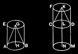 Therefore also, as the axis GH is to the axis KL, so is the cone ABG to the cone CDK and the cylinder EB to the cylinder FD. Q. E. D.